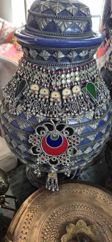 A beautiful handmade well-made item added to our collection. The work the artisan put is excellent, and all high-quality products are used to make this piece. The necklace is an afghani glass necklace, and you will love the color combination it has. It is heavy and covers your whole neck. The necklace is one of its kind that will give both modern and traditional touch to your look.
