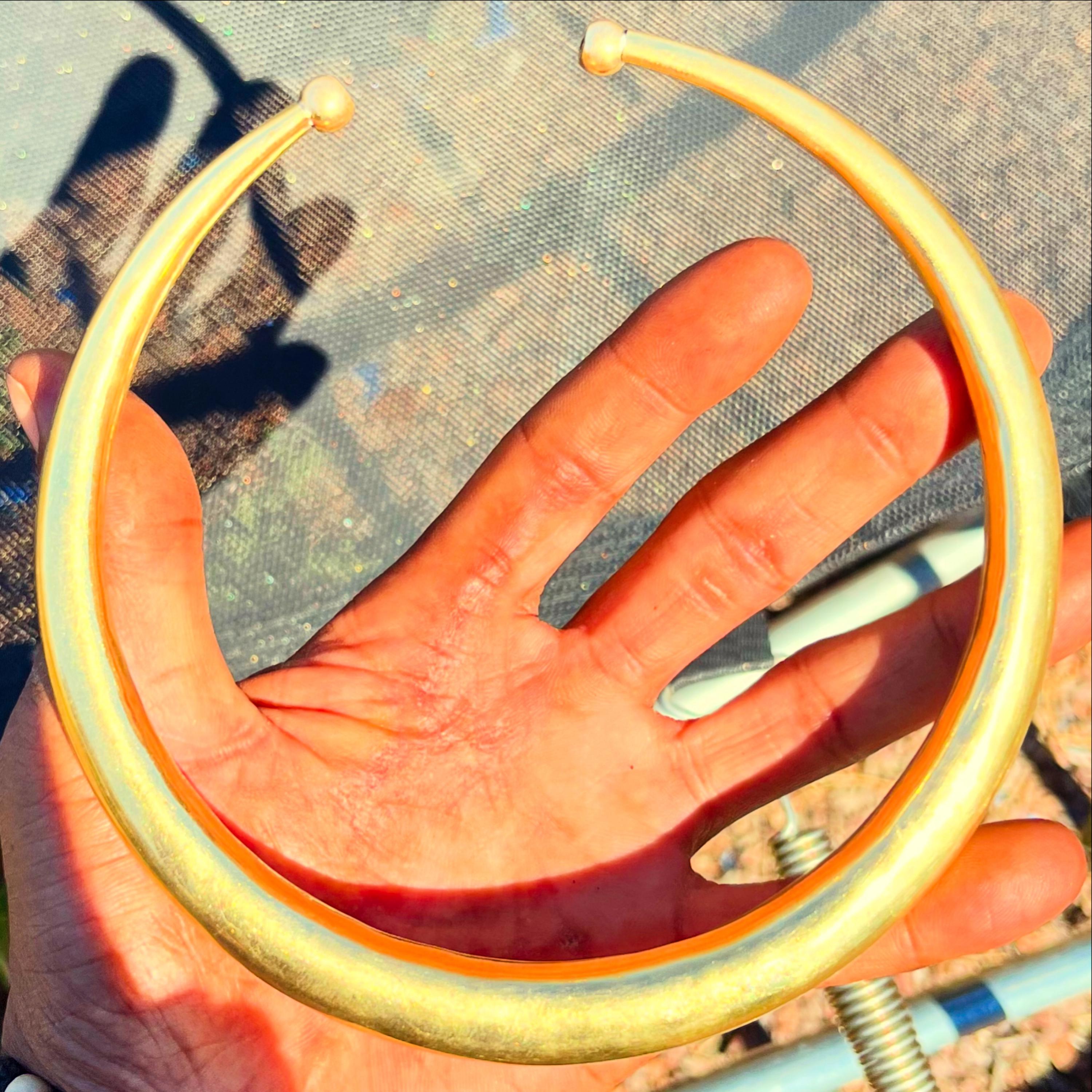 This hollow tribal choker is a bold yet minimalist brass necklace that embodies boho jewelry charm and artistic craftsmanship. Designed as a gold choker with a sleek collar style, it makes a stunning statement necklace for those who love ethnic yet modern fashion. Perfect for festival jewelry styling, this handmade brass choker collar complements both traditional and contemporary outfits, offering a timeless, minimalist necklace look that stands out effortlessly. Golden Brass Choker Necklace, Smooth Brass Choker, Brass Hasli Necklace, Tribal Necklace, African Golden Necklace, African Statement Choker.