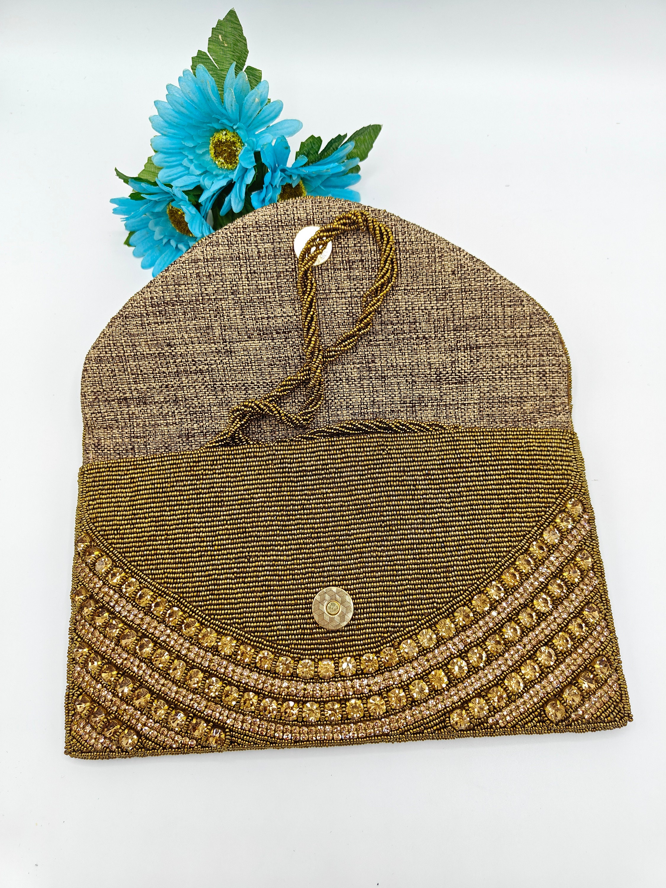 Handmade Golden Crystal Embroidered Beaded Envelope Clutch Purse - Bridal Indian Wedding, One of a Kind, Cross-body or Shoulder Bag, Gift for Her, Mom, Wife, Birthday, Wedding, Heavily Embellished, Brown Golden Crystal Clutch