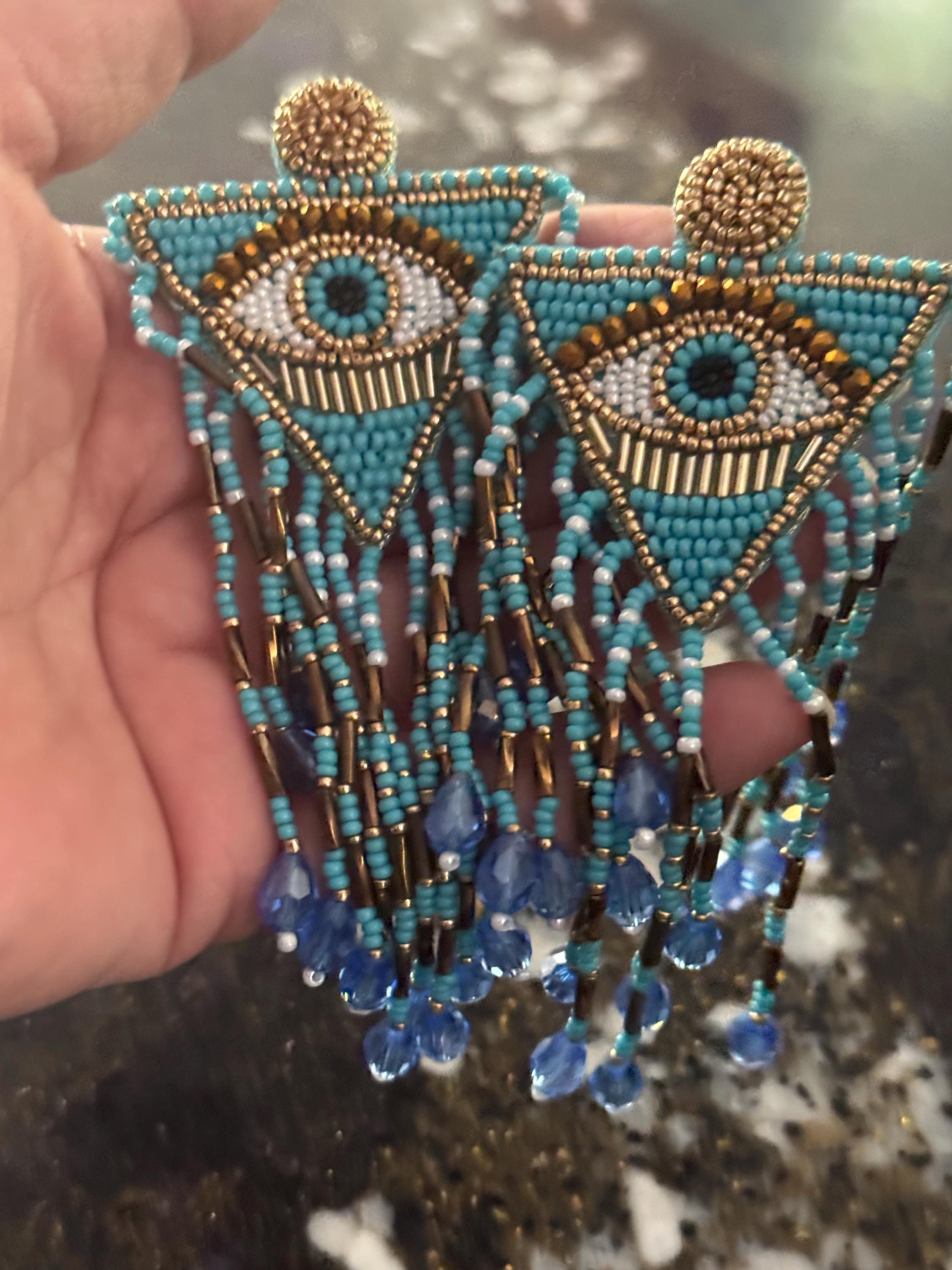 Elevate your accessory game with our stunning Evil Eye Earrings, exquisitely handcrafted from vibrant teal and blue seed beads that shimmer beautifully in the light. These statement earrings showcase a unique fringe design and carry the ancient significance of evil eye protection, making them a perfect blend of style and meaning. Their lightweight and dangle style ensures comfortable wear, whether dressing up for a special occasion or adding a pop of color to your everyday outfit. Gift yourself or a loved one a pair of these enchanting earrings and embrace their positive energy—because every accessory should tell a story!