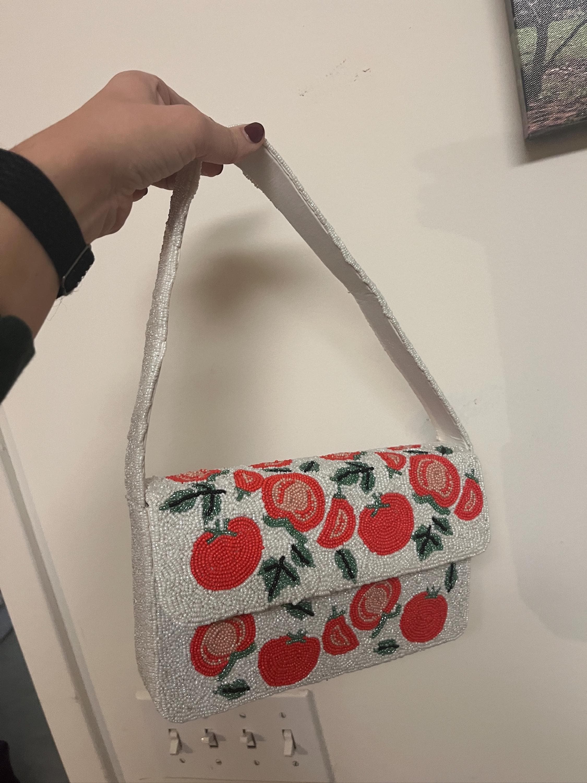 This white beaded shoulder bag is a playful and artistic accessory, hand-embroidered with vibrant red tomato motifs and detailed green leaves against a seed bead base. Designed with an envelope flap and a sturdy shoulder strap, it combines functionality with bold, fun style. The tomato embroidery creates a unique look, making this bag stand out as a quirky yet fashionable piece for casual outings, art-inspired wardrobes, or statement evening wear. Crafted with intricate beadwork, the bag has a secure compartment ideal for essentials like a phone, keys, or makeup. Buyers searching for a white beaded shoulder bag, tomato embroidered purse, quirky beaded handbag, fun vegetable fashion bag, seed bead envelope clutch, or unique artisan embroidered shoulder bag will find this design a perfect match for festivals, casual dinners, or everyday statement fashion.